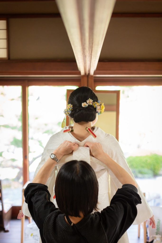 本物の技術と豊かな経験を持つだけでなく、「幸せな一日の空気を大切に出来る人たち」こそ、本当のプロフェッショナルです。撮影には常に同行し、ヘアメイク直しや着付け、動きのサポートをいたします。
